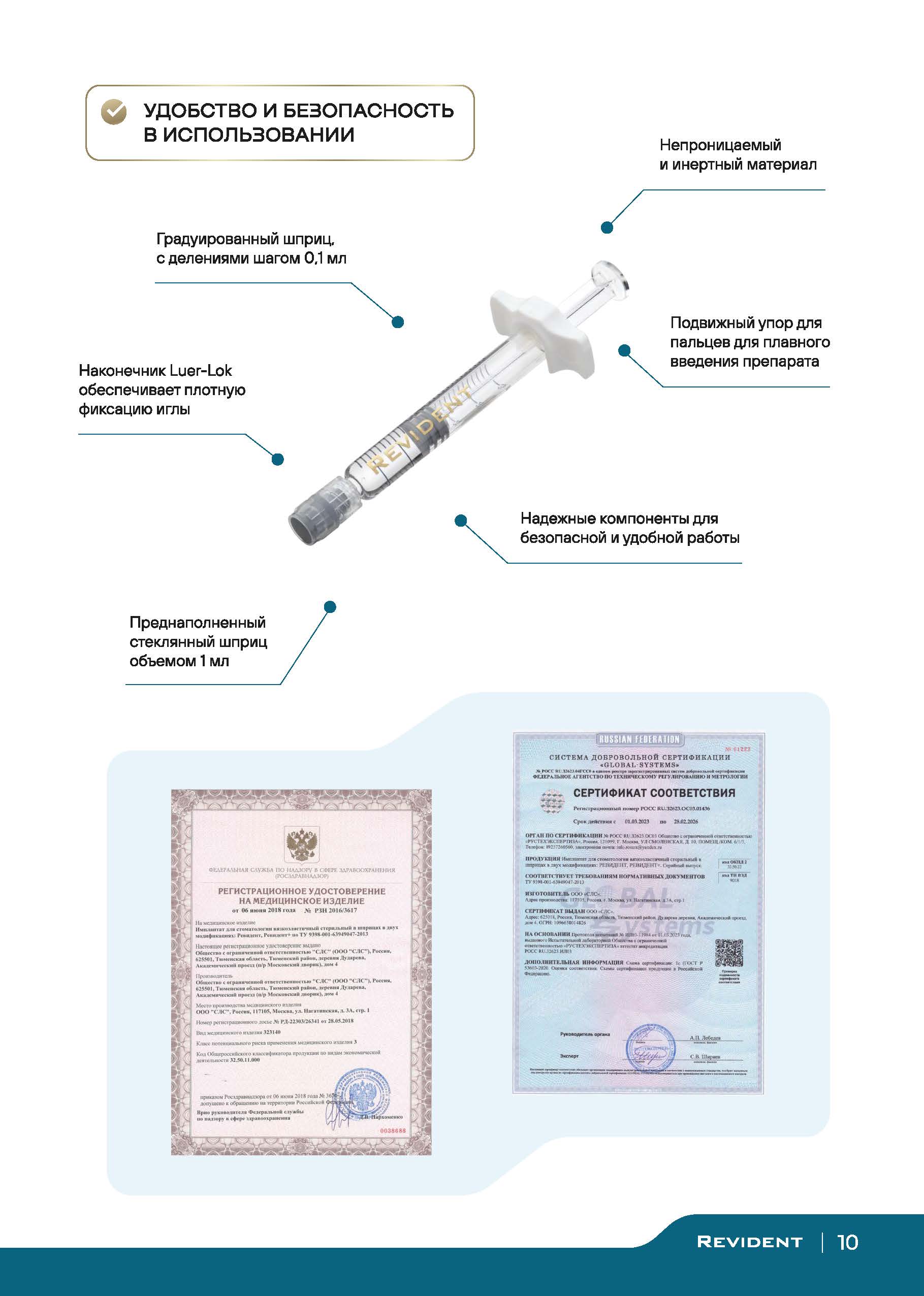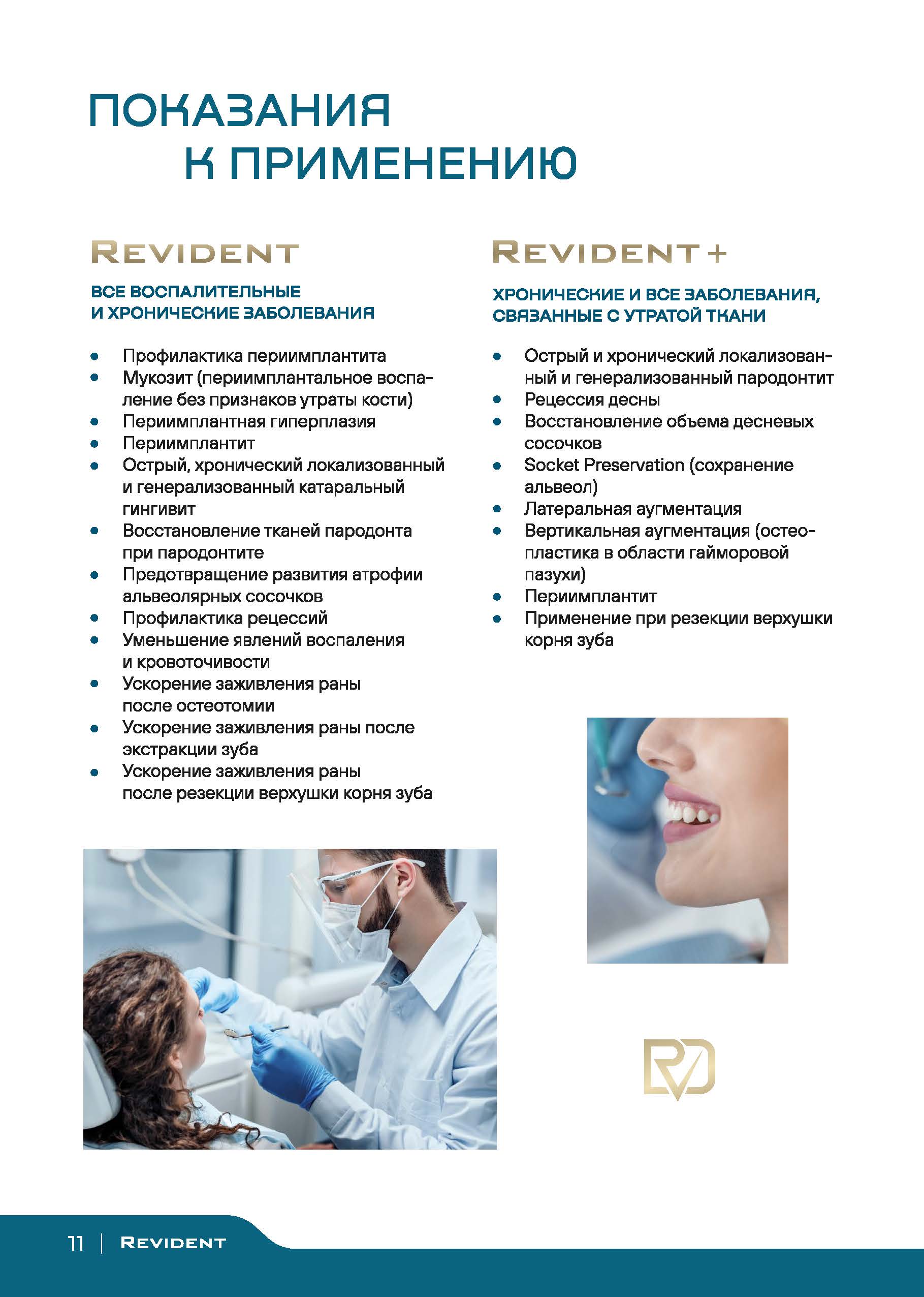 REVIDENT предназначен для внутри- и подслизистого введения в слизистую оболочку полости рта, в том числе в переходную складку, прикрепленную маргинальную десну и межзубной сосочек, пациентам от 18 лет для профилактики развития атрофии межзубных сосочков, восстановления объема межзубных сосочков, класса 1 (по классификации дефектов межзубных сосочков Норланда и Тарнова), регенерации твердых и мягких тканей полости рта, уменьшения признаков воспаления полости рта.